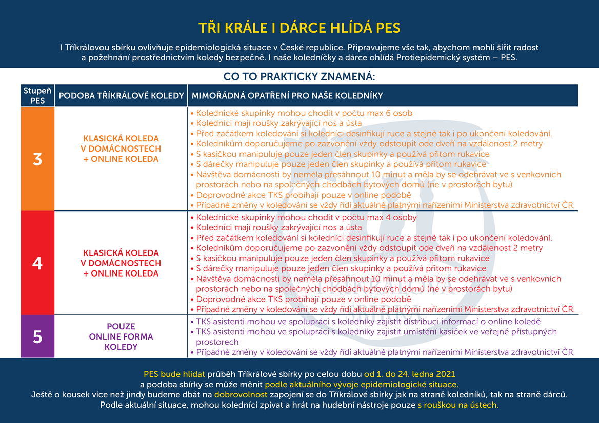 Tříkrálovou sbírku hlídá PES Milí přátelé Tříkrálové sbírky, v případě, že nebudou vydána nová vládní opatření, budeme se při koledování řídit níže uvedenou tabulkou. Na akutální vládní opatření budeme pružně reagovat. S ohledem na situaci vám bohužel nemůžeme slíbit, že Vás koledníci osobně navštíví. Například v Plzni máme o třetinu méně koledníků než v minulém roce, v některých obcích, kde se tradičně koledovalo, nám nyní tříkrálové skupinky chybějí (Staňkov). Zachovejte nám přízeň, i když se třeba neuvidíme osobně. S koledníky se ale budete vždy moci setkat online, a to na oficiálním webu sbírky www.trikralovasbirka.cz, kde je připravena i online kasička. Těšíme se na vás osobně i online!