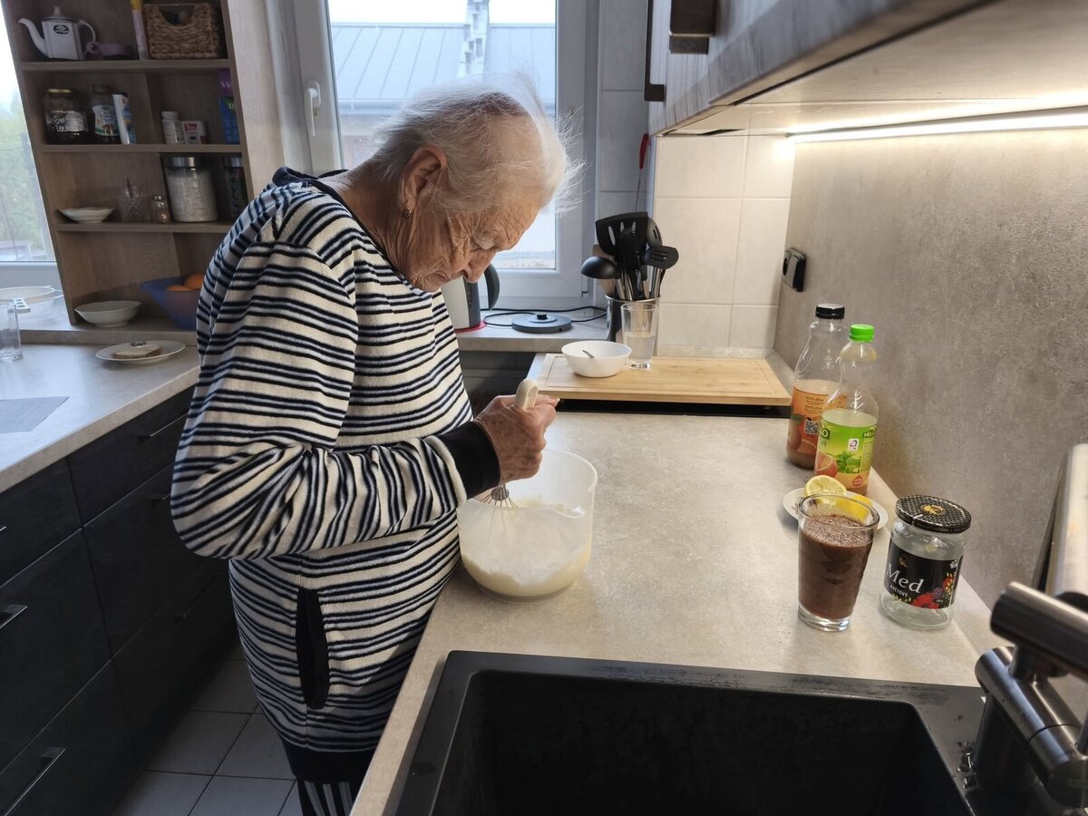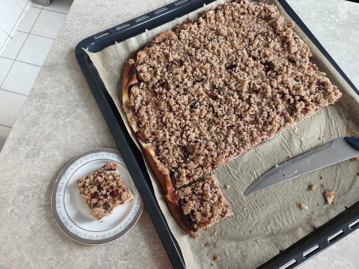 Včera jsme spojili síly a upekli koláč z kynutého těsta - s tvarohem, švestkami a skořicovou drobenkou.